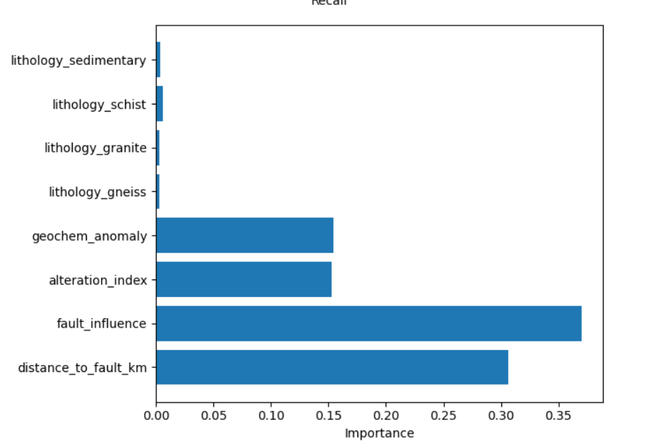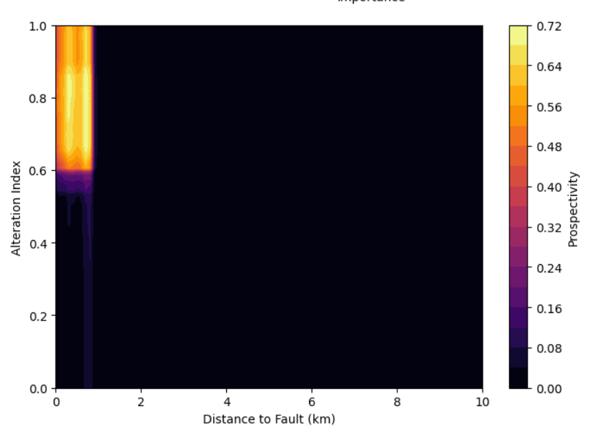 This GeoAI project demonstrates how geological indicators such as structural proximity, alteration intensity, and geochemical anomalies can be integrated with machine learning models to highlight potential mineral prospectivity zones.